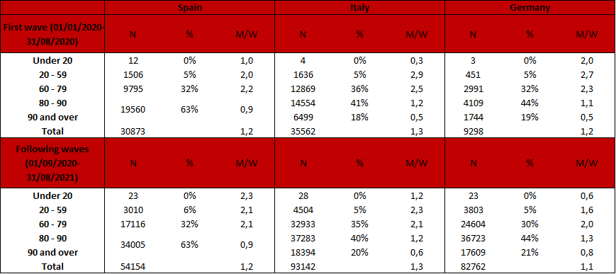 Given the vulnerability to the virus of the elderly, national population age structures play a decisive role in the number of deaths. Table 7.1 shows deaths by age and sex for three countries, Spain, Germany, and Italy, for the period until 1 September 2020 (the first wave) and the period from 1 September 2020 to 1 September 2021 (following waves). For Spain, the data covers the number of deaths for people aged 80 and over, with no differentiation of deaths from 80 to 90 or those of individuals aged 90 and over.